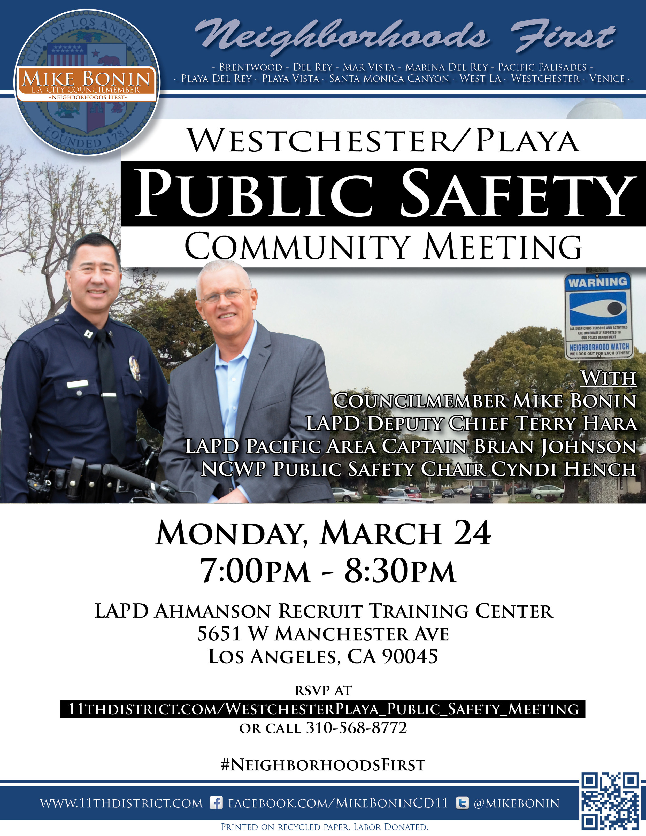 Join Councilmember Mike Bonin, LAPD Deputy Chief Terry Hara and LAPD Pacific Division Captain Brian Johnson at a community meeting to discuss public safety in Westchester.