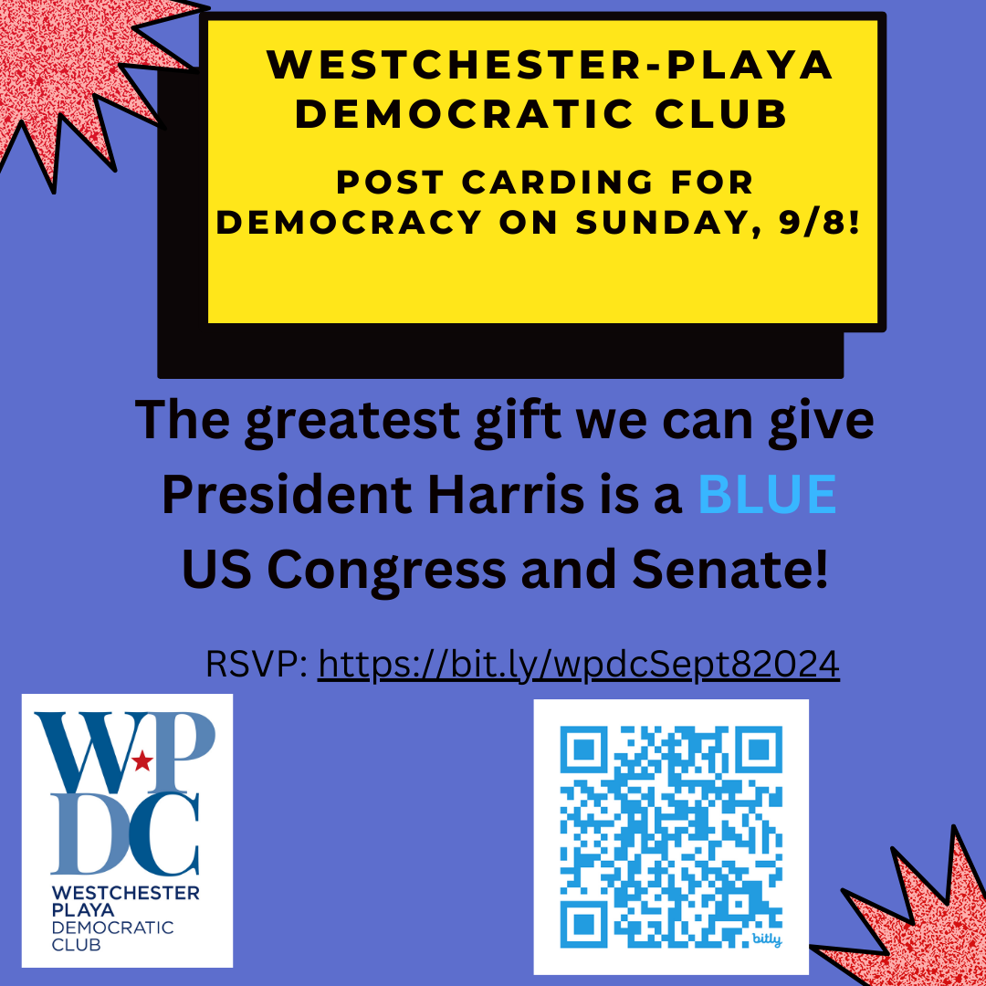 Postcarding Event Sunday, September 8, 2024 3:00 PM 4:00 PM Westchester-Playa Democratic Club Los Angeles, CA 90045 (map) Google Calendar ICS